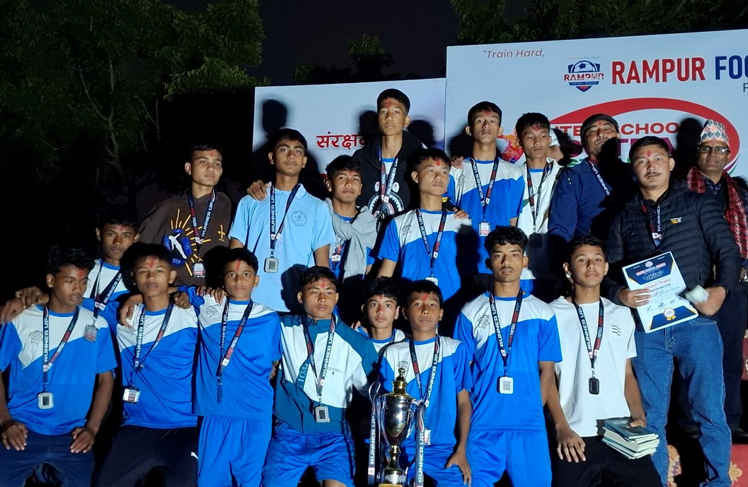पाल्पा, रामपुर अंग्रेजी आवासीय माध्यमिक विद्यालय रामपुर–५ पाल्पाले अन्तर विद्यालय स्तरीय फुटबल प्रतियोगिताको उपाधी जितेको छ । रामपुर नगरपालिका– ७, किसानबारीमा शनिबार भएको प्रतियोगिताको फाइनल खेलमा दरैठाँटी माध्यमिक विद्यालय रामपुर –६ लाई पराजित गर्दै उपाधि चुम्न सफल भएको हो ।