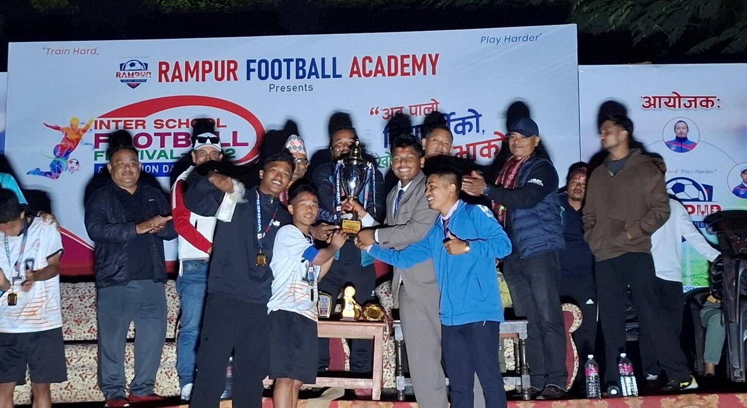 विजेता टिमलाई एक कार्यक्रमका विच पुरस्कार प्रदान गरिएको थियो । रामपुर फुटबल एकेडेमीका अध्यक्ष अनिल शाही ठकुरीको अध्यक्षतामा भएको कार्यक्रम रामपुर नगरपालिकाका प्रवक्ता एवं वडा नं. १ का वडा अध्यक्ष कपिल बहादुर खाँणको प्रमुख आतिथ्यतामा भएको थियो । विजेता टिमलाई पुरस्कार वितरण गर्दै प्रमुख अतिथी खाँणले प्रतियोगिताले विद्यार्थीको प्रतिभा पहिचान संगै उनीहरुलाई सिप सिक्ने अवसर प्रदान गरेको बताउनुभयो । प्रतियोगिताले नयाँ बाल प्रतिभाहरुमा देखिएको खुशीले थप उत्साह जगाएको बताउनुभयो । उहाँले खेलकुद क्षेत्रको उत्थानका लागि नगरपालिकाले थप कार्यक्रम सञ्चालन गर्ने बताउनुभयो ।